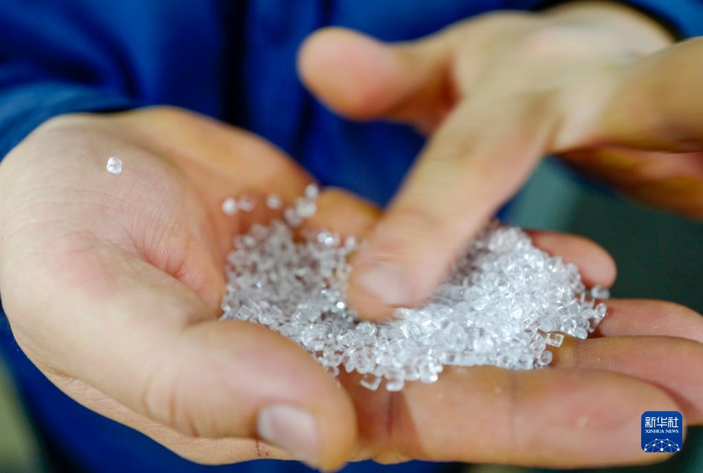 2月21日,在重庆万凯新材料科技有限公司生产车间,技术工人对生产出的食品级PET高分子新材料进行检查。