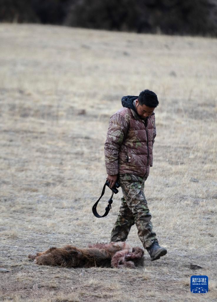 2月21日,更求曲朋在昂赛大峡谷里查看一只被猎杀不久的白唇鹿。