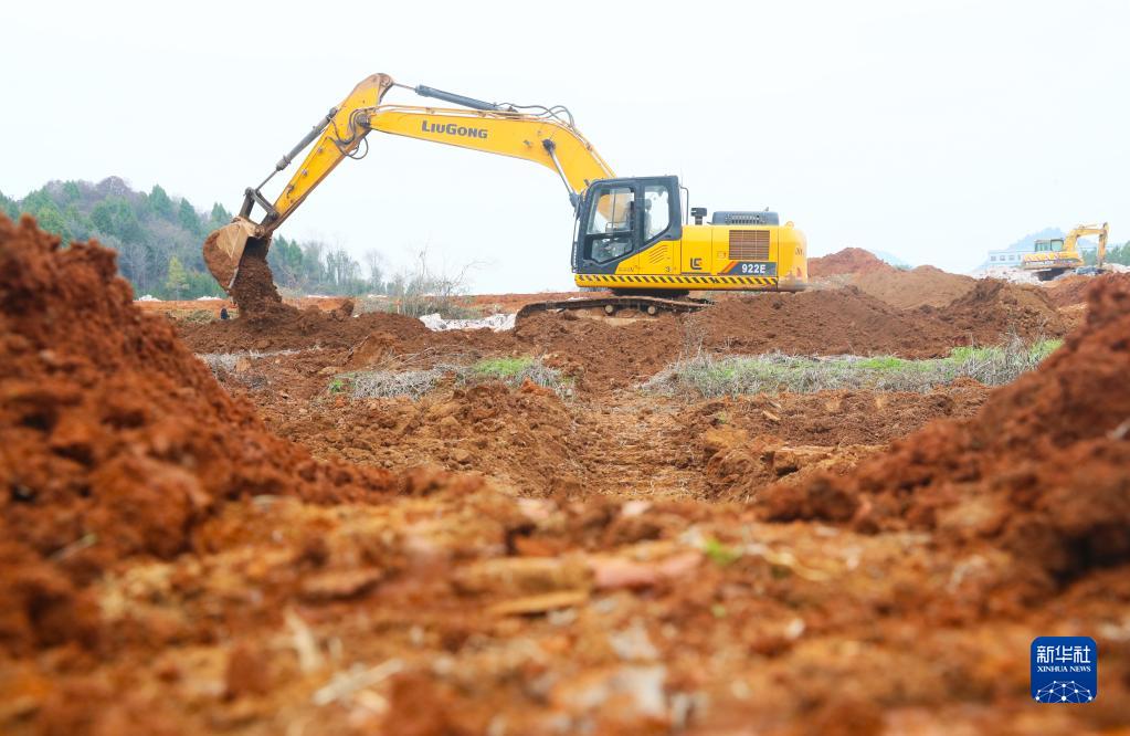 2月24日,湖南省永州市新田县龙泉街道石古湾村,工程人员在建设高标准农田。