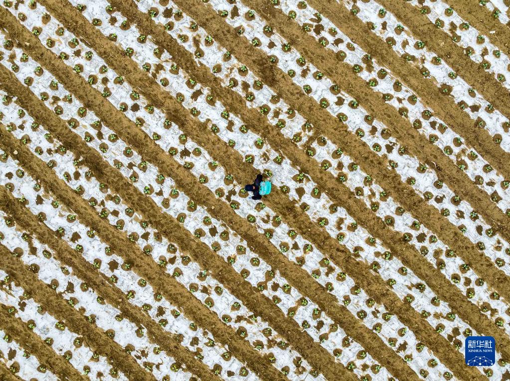2月24日,村民在贵州省安顺市关岭布依族苗族自治县断桥镇坝陵村蔬菜基地劳作(无人机照片)。