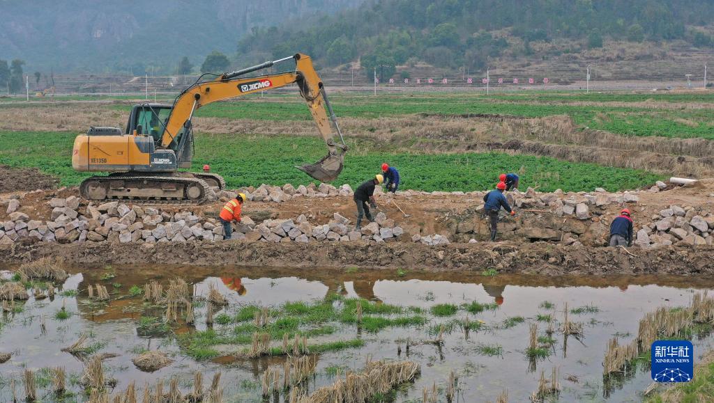 2月24日,施工人员在浙江省台州市仙居县双庙乡农田修建灌溉水渠和硬化机耕道路(无人机照片)。