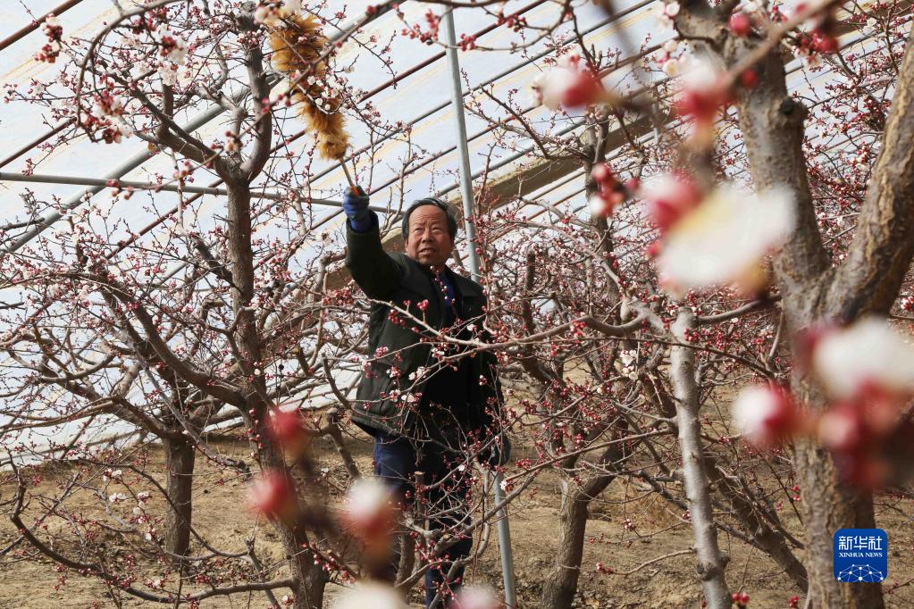 2月25日,甘肃省定西市安定区凤翔镇村民给杏花人工授粉。
