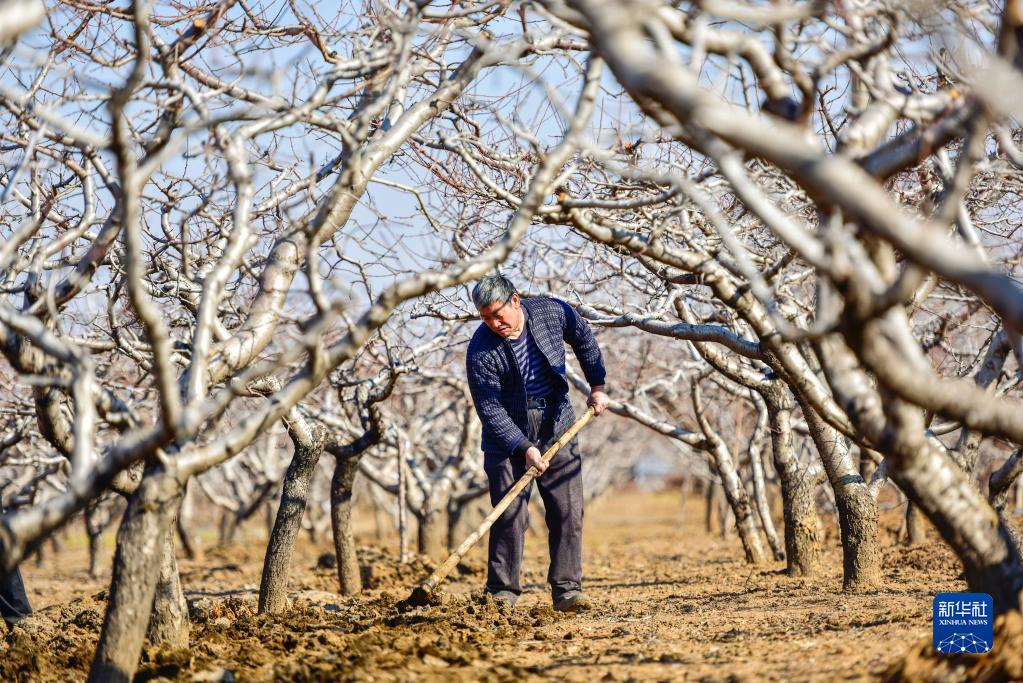 2月25日,农民在山东省青州市云门山街道付家村一处桃园里劳作。