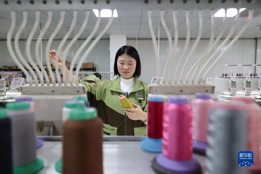 2月25日,工人在浙江省湖州市德清县新安镇一家纺织企业生产车间内忙碌。