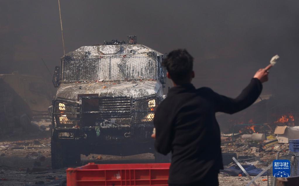 2月22日,在约旦河西岸城市纳布卢斯,巴勒斯坦人向以色列军车投掷石块。