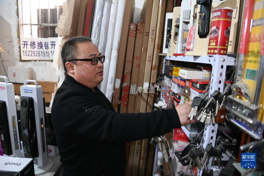 2月23日,在西安市灞桥区,残疾人锁匠苏小泉整理货架上的锁具。