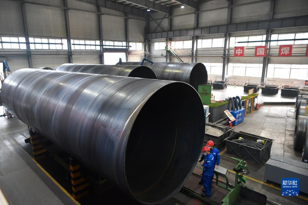 2月9日,在位于陕西省宝鸡市的宝鸡石油钢管有限责任公司生产车间,工人在检查陕西引汉济渭工程即将使用的管材。