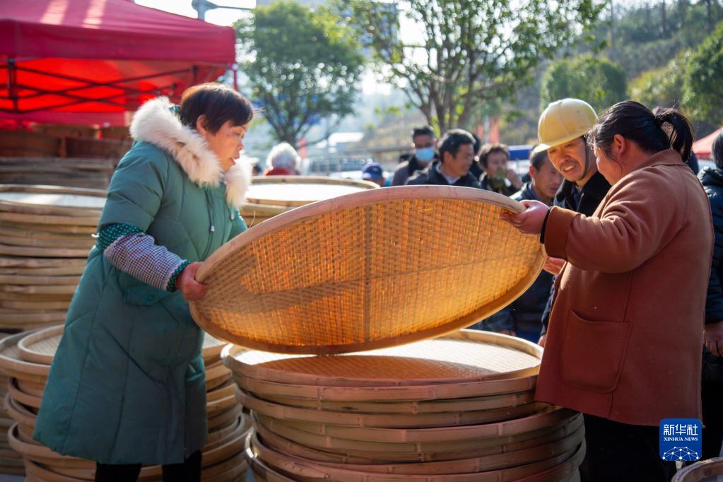2月25日,人们在武夷山“柴头会”上选购传统竹制农具。