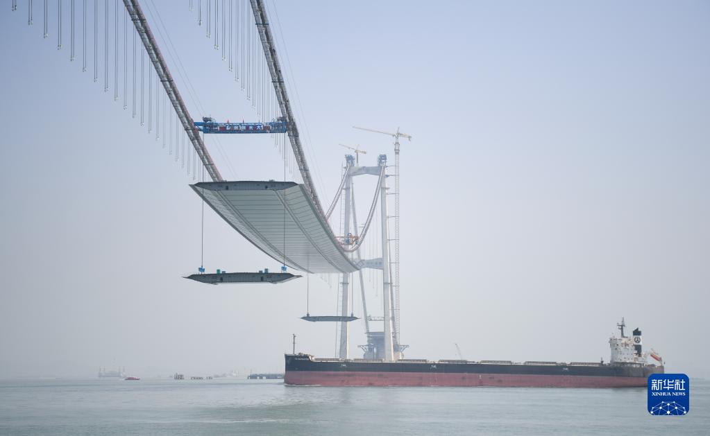 2月22日,货轮通过正在吊装钢箱梁的深中通道伶仃洋大桥。