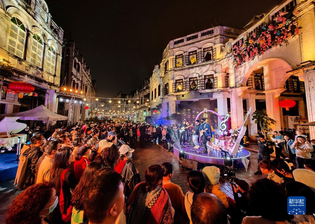 游客在海口骑楼老街的中西合璧市集观看乐队演出(2月3日摄)。