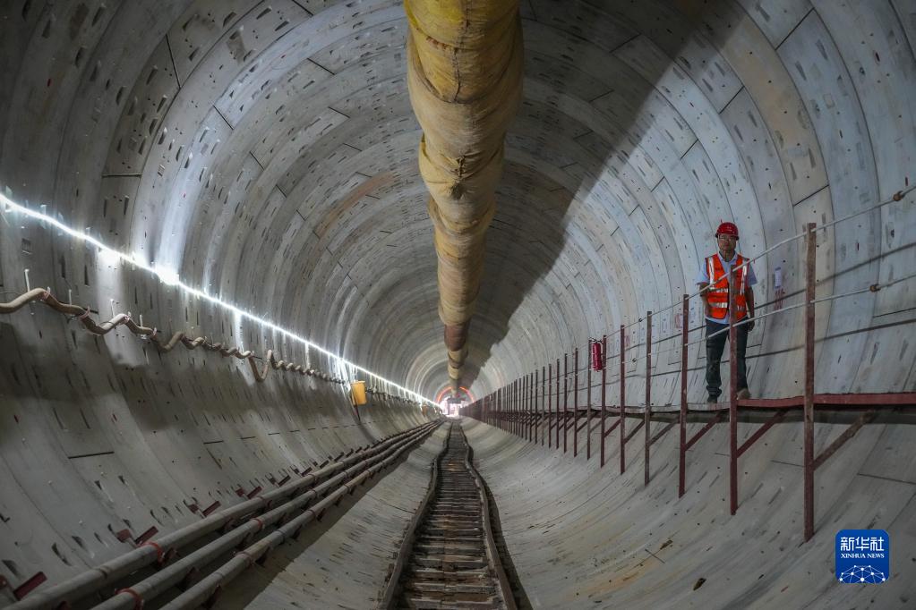 2月25日,一名技术员行走在贯通的东莞地铁1号线水濂山站右线盾构隧道内。