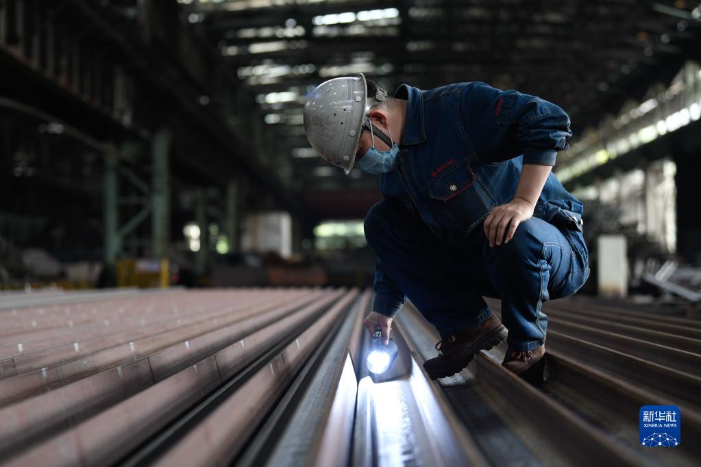 在攀钢钒轨梁厂,工人对轧制成型的百米钢轨进行表面检测(2月24日摄)。