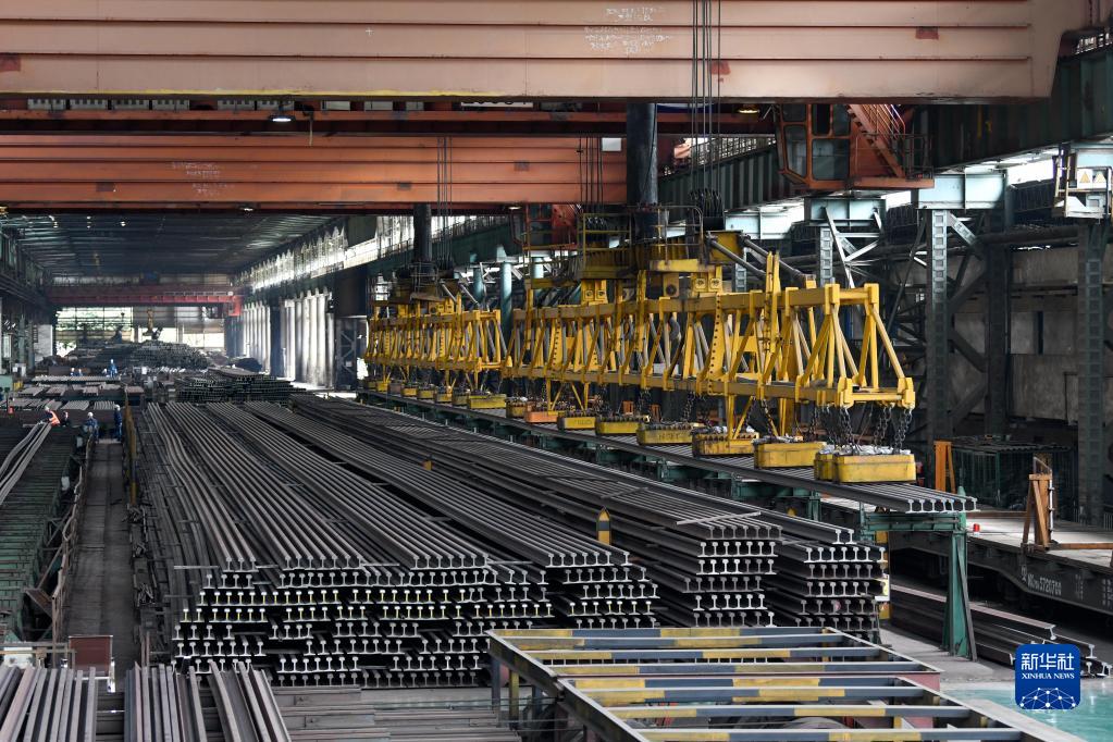 在攀钢钒轨梁厂,百米钢轨等待装车(2月24日摄)。