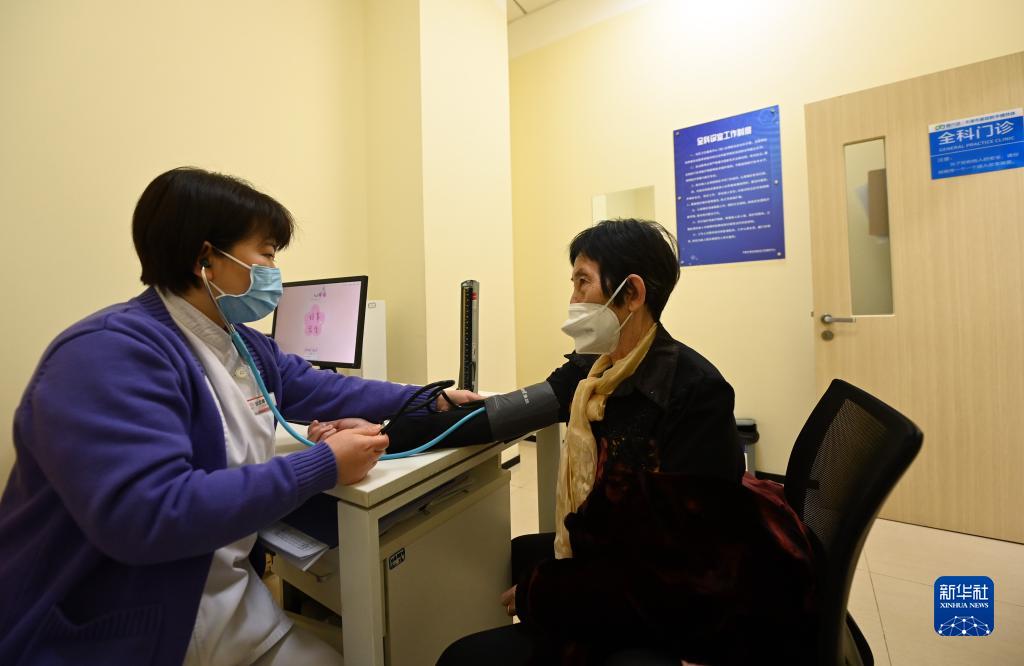在中新天津生态城第三社区卫生服务中心,医生在为患者测量血压(2月24日摄)。