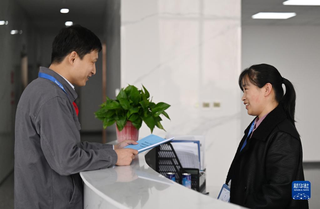 在莱伯泰科(天津)科技有限公司,刘学(左)和于丽新在交流(2月23日摄)。今年37岁的刘学曾在北京工作多年。2019年,他和妻子于丽新一起被派到天津宝坻京津中关村科技城,参与分公司的设立。现在他们一家人已经在天津落户。于丽新希望家人健康平安、孩子学业有成。刘学说,妻子的愿望就是他的愿望。