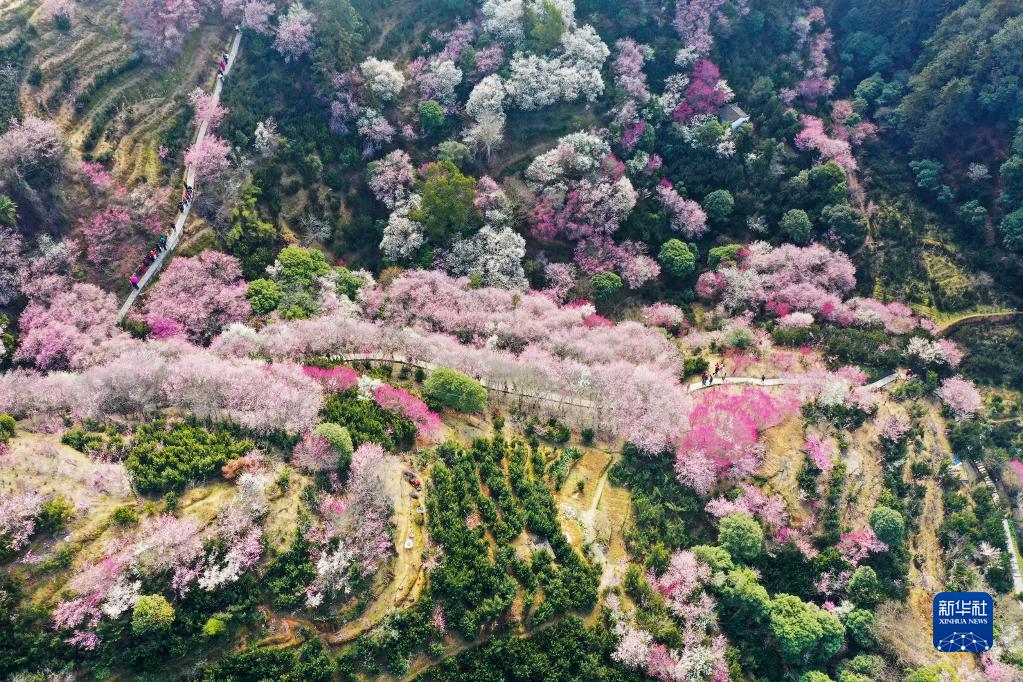 2月25日,游人在安徽省黄山市歙县雄村镇卖花渔村赏花(无人机照片)。