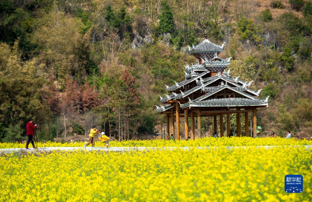 2月25日,人们在贵州省黔东南苗族侗族自治州从江县洛香镇上皮林村油菜花田间赏花游玩。