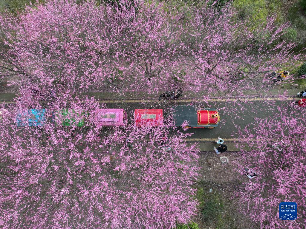 2月25日,游客乘坐观光小火车穿行在贵州省遵义市余庆县子营街道梅花园内赏花(无人机照片)。