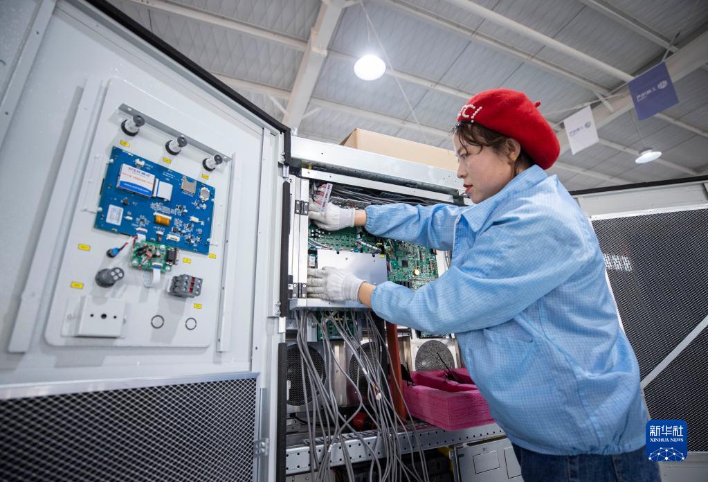 在位于宁夏同心工业园区清洁能源产业园的上能电气(宁夏)有限公司车间内,工人为逆变器布置电缆走线(2月23日摄)。