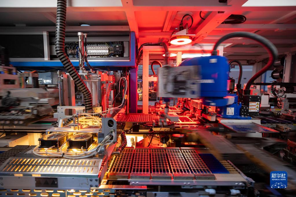 在位于宁夏同心工业园区清洁能源产业园的英利新能源(宁夏)有限公司智能制造车间内,自动化设备在加工光伏组件(2月23日摄)。