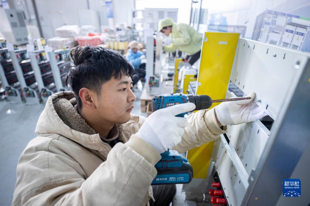 在位于宁夏同心工业园区清洁能源产业园的上能电气(宁夏)有限公司车间内,工人在加工逆变器所需的配电单元(2月23日摄)。