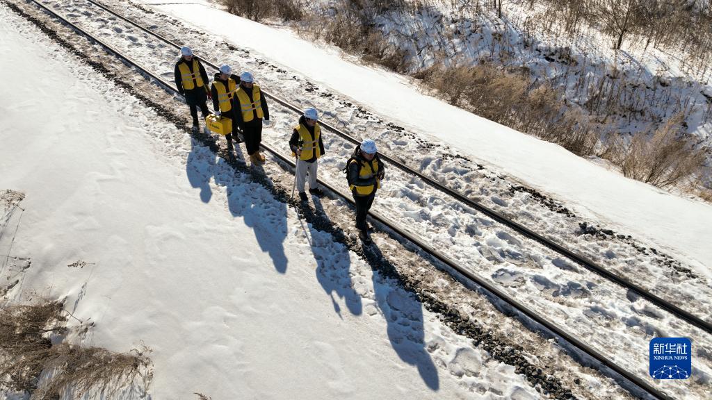 2月25日,黄腾(左一)与同事在佳抚铁路佳富段进行外业调查(无人机照片)。
