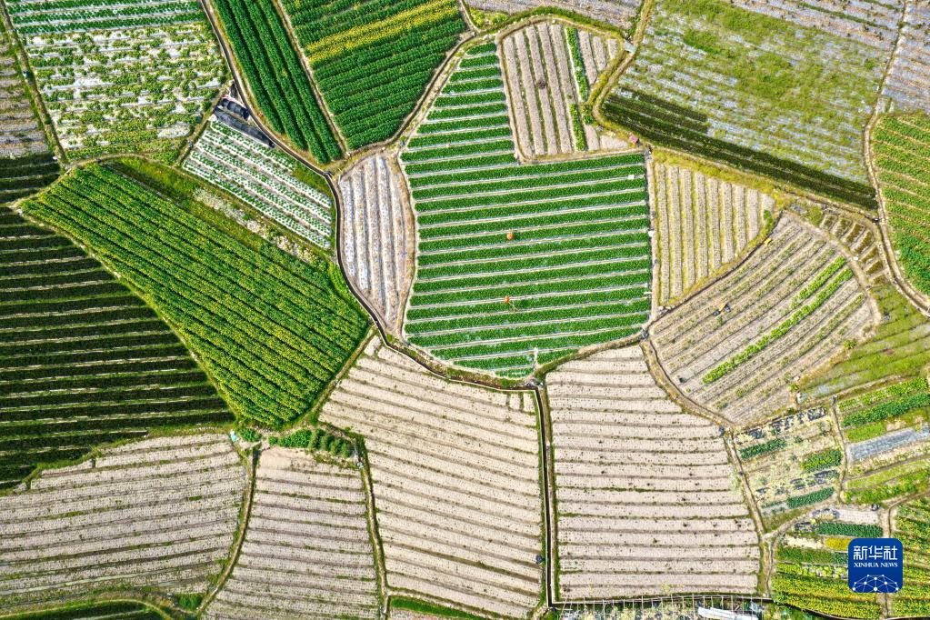 春耕时节,在福建省福州市乡村山岭间,一块块形状各异、五彩斑斓的田地犹如大地上的拼图,呈现别样的春耕画卷。