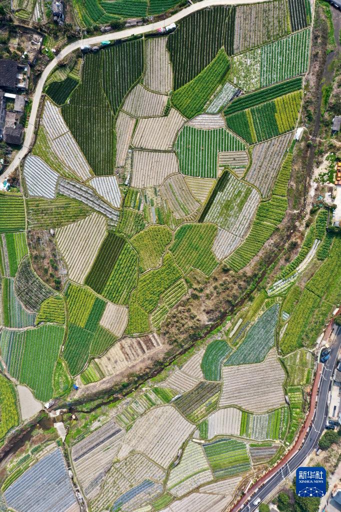 春耕时节,在福建省福州市乡村山岭间,一块块形状各异、五彩斑斓的田地犹如大地上的拼图,呈现别样的春耕画卷。