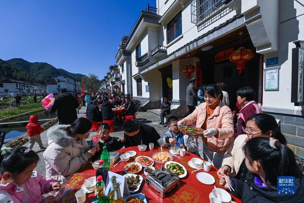 2月26日,游客们在莲花镇戴家新村的百家宴上品尝特色美食。