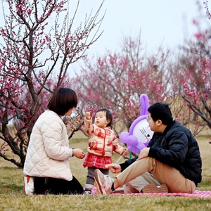 2月25日,游人在长安唐村梅园内赏梅休闲。