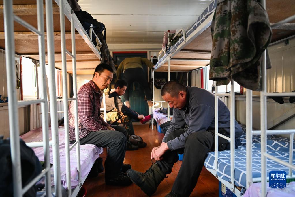 2月23日早晨,乌龙岱林场402工队职工在驻点的移动板房内穿上衣物准备上山作业。