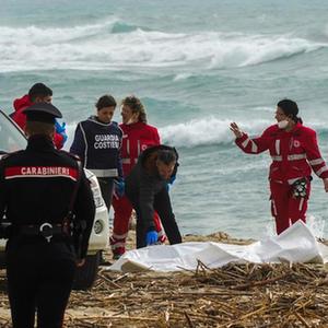 2月26日,在意大利南部卡拉布里亚大区库特罗附近,红十字会志愿者和海岸警察发现一具移民船沉船事故遇难者遗体。