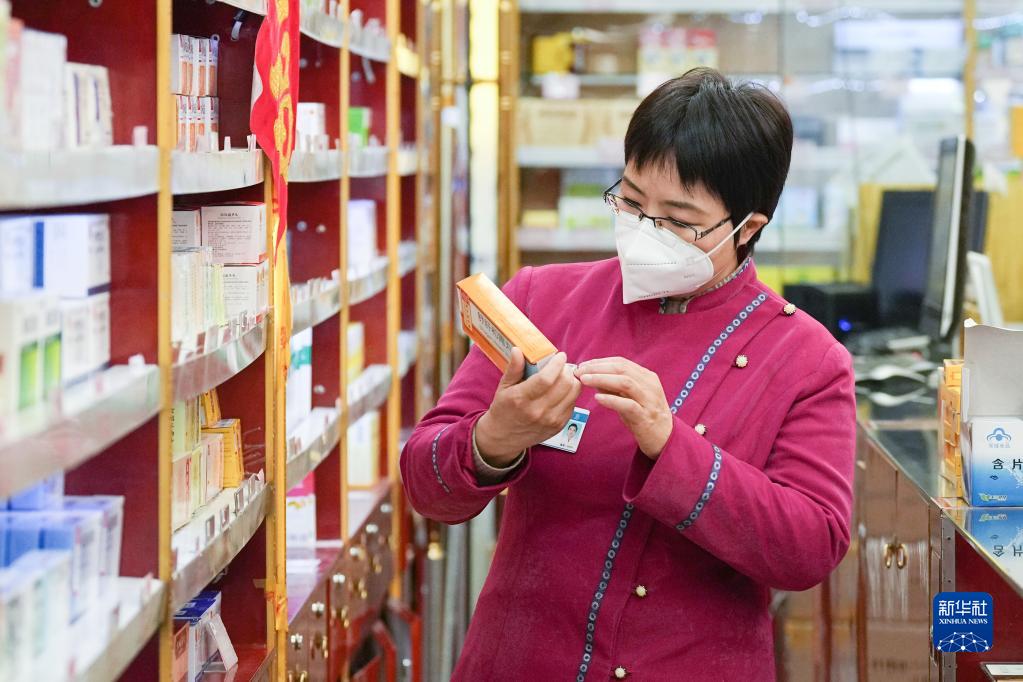 在白塔寺药店,张海鸥查看药店内的药品(2月22日摄)。