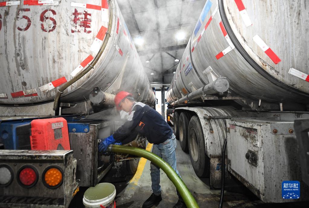 2月21日,四川一家环保科技有限公司员工将油罐车运来的餐厨废油转送至生产线。