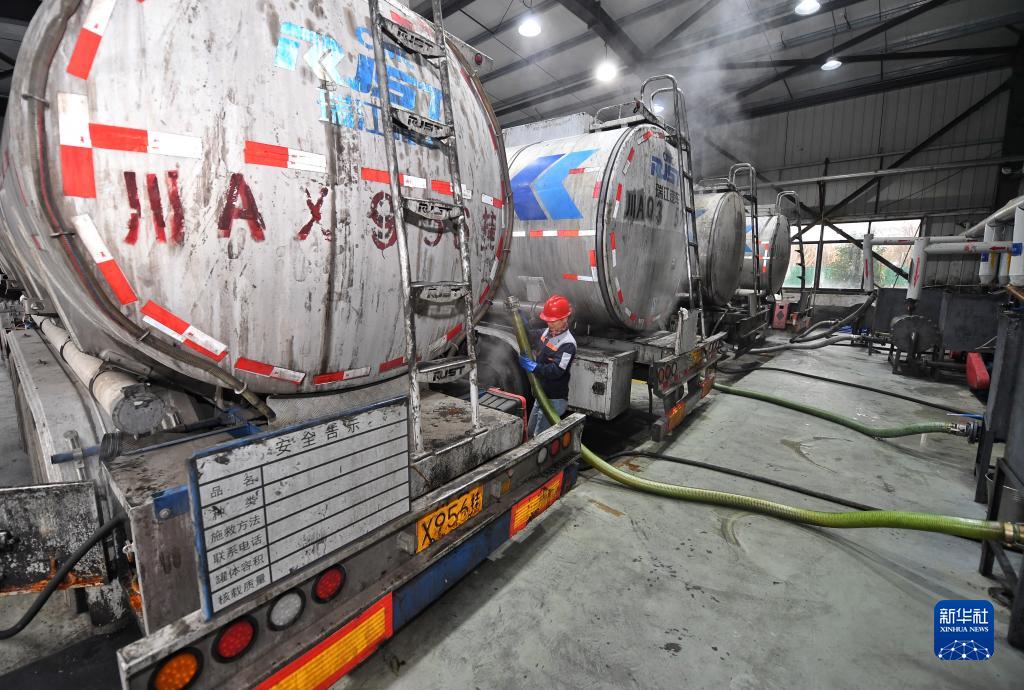 2月21日,四川一家环保科技有限公司员工将油罐车运来的餐厨废油转送至生产线。