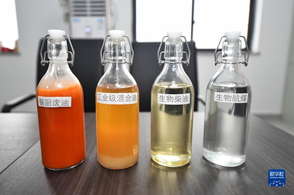 这是四川一家环保科技有限公司展示的餐厨废油、工业级混合油、生物柴油和生物航空煤油样品(2月21日摄)。