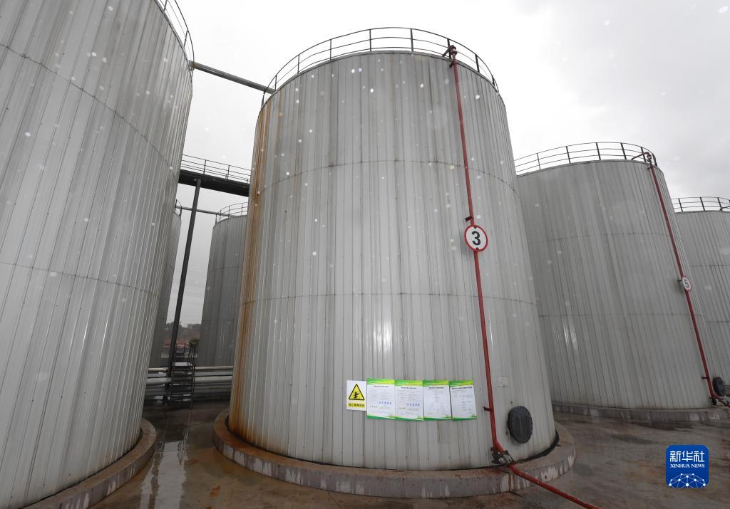 这是四川一家环保科技有限公司成品工业级混合油储存罐(2月21日摄)。