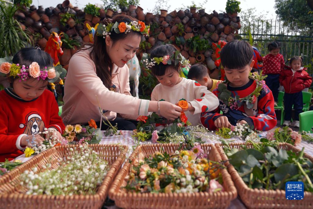 当日,重庆市北碚区缙云幼儿园开展“编花环 迎春天”手工制作活动,孩子们在老师的指导下,用枝条和鲜花编制成一顶顶多彩花环,感受春天的气息,喜迎春天的到来。