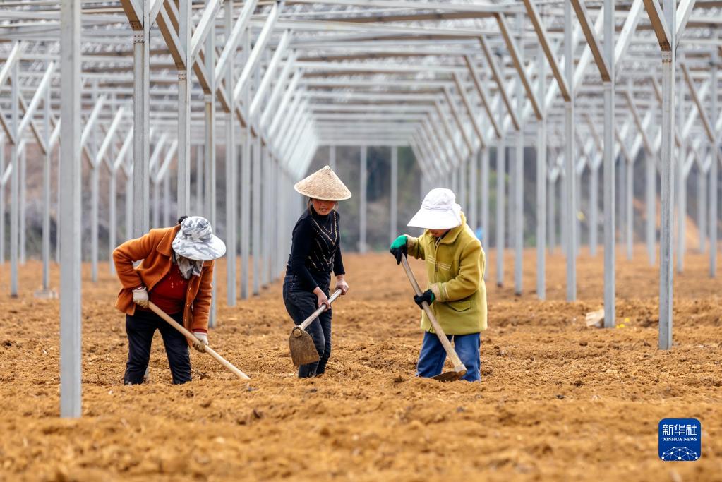 2月27日,村民在贵州省黔西市林泉镇清塘村蔬菜种植基地平地起垅。