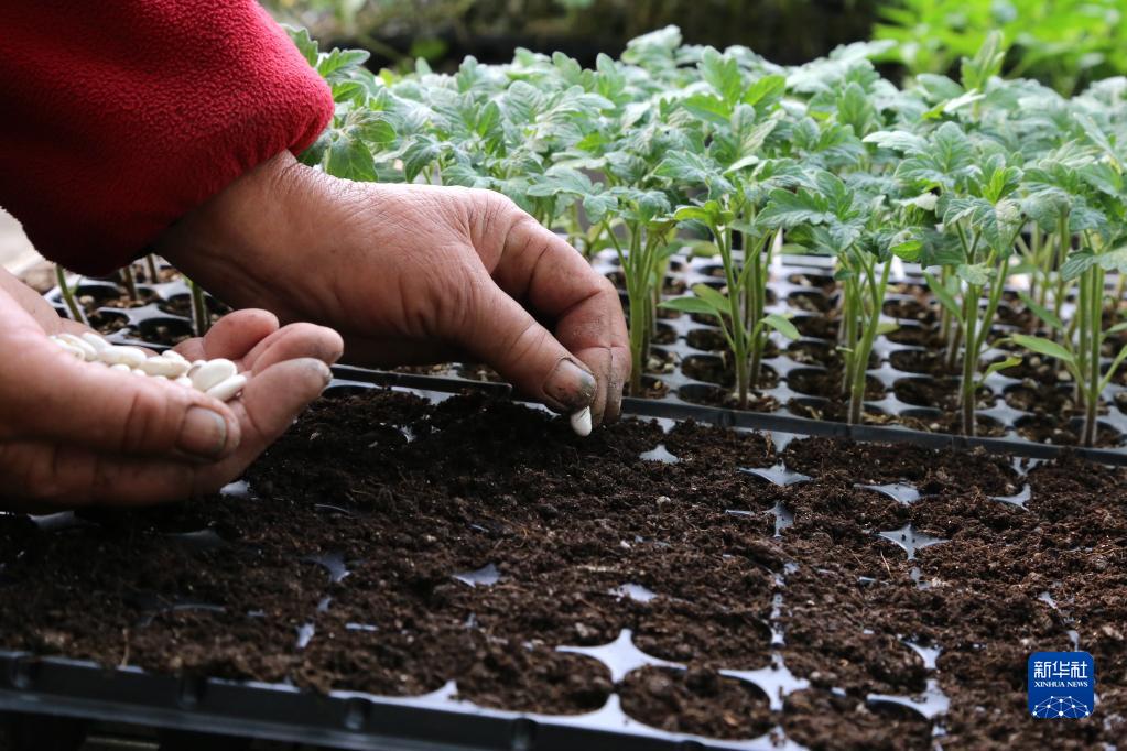 2月28日,山东省滨州市惠民县淄角镇狮豹刘村农民在育苗大棚内播种芸豆种子。