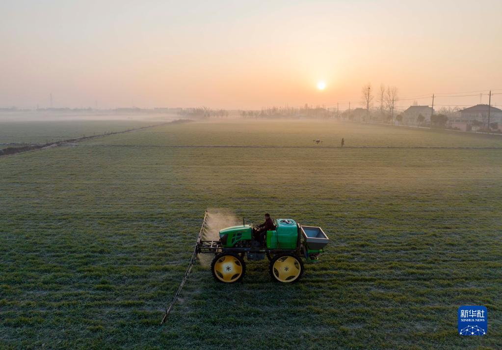 2月28日,在江苏省泰州市姜堰区顾高镇塘桥村松青家庭农场小麦田间,农户驾驶植保机进行喷药作业(无人机照片)。