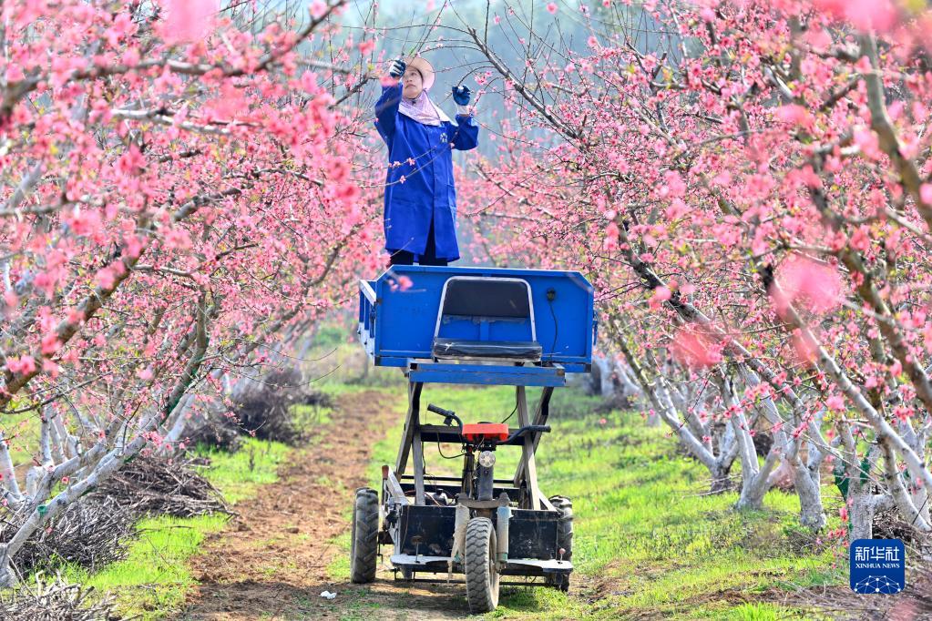 2月28日,村民在广西柳州市柳江区穿山镇林寺村鹰嘴桃种植基地进行桃园管护作业。