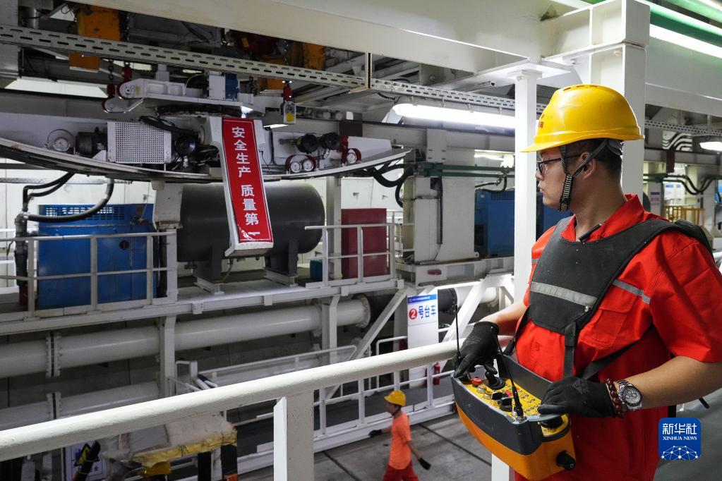 2月28日,施工人员在广湛铁路湛江湾海底隧道盾构区间操作吊机。