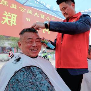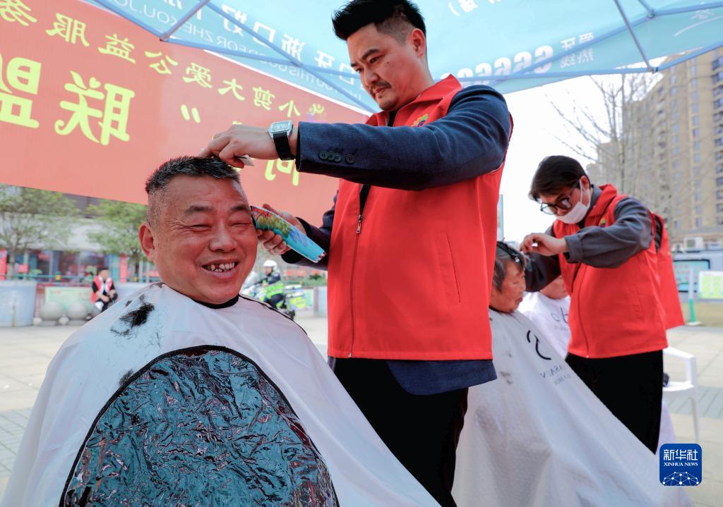 2月28日,在长兴县和文化广场上,雉城街道社工志愿者给市民免费理发。