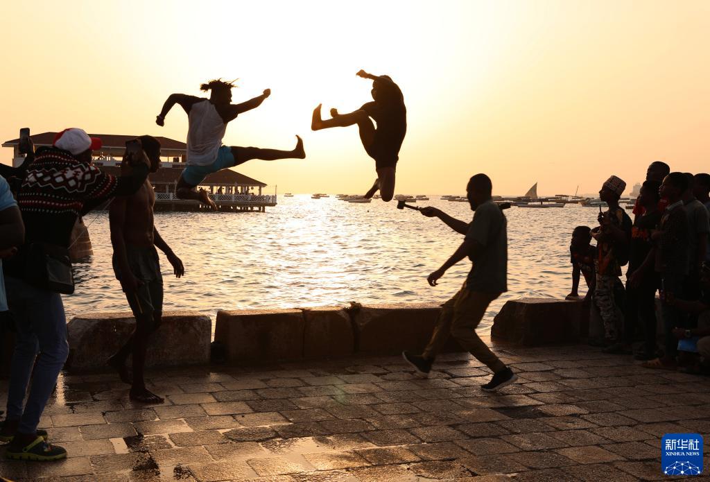 2月21日,人们在桑给巴尔石头城的海边跳水。