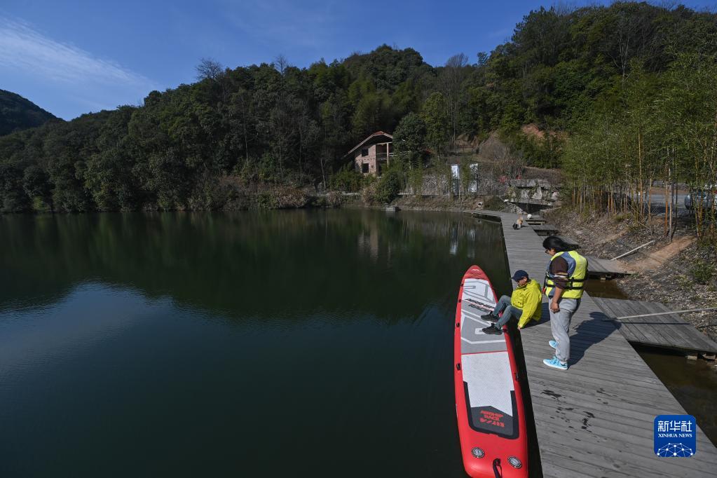 2月28日,在杭州市临安区玲珑街道前山村51Camp营地,负责人丹裕(左)在教一名游客如何使用桨板。