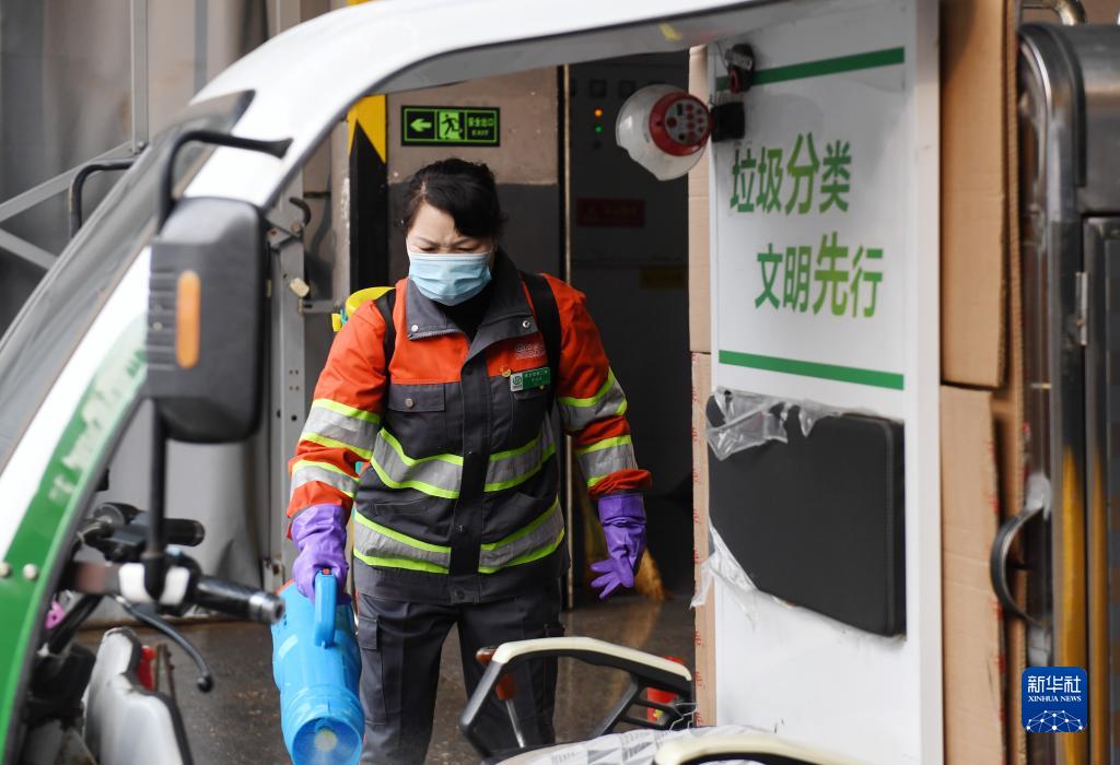 2月17日,刘明群给垃圾清洁站内正在倾倒垃圾的车辆消毒。