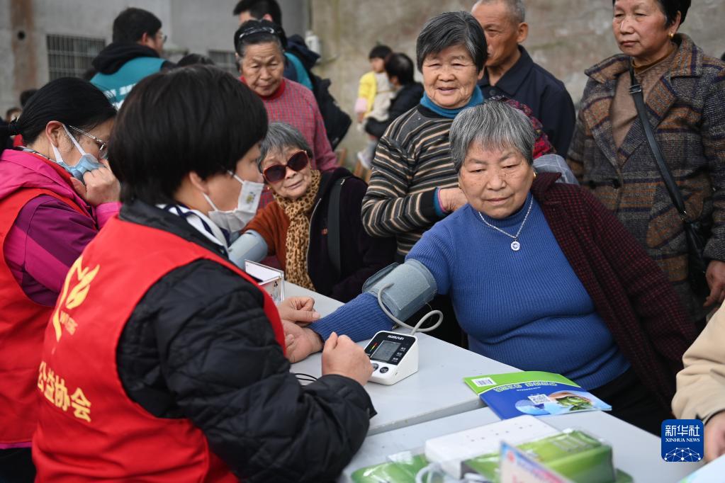 3月1日,志愿者在宁波市奉化区锦屏街道城西岙村为村民测量血压。