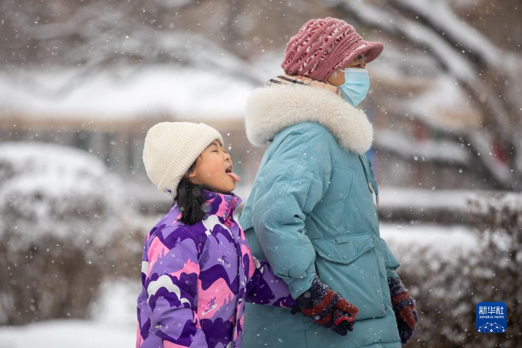 3月1日,在哈尔滨市古梨园,一名小朋友伸出舌头品尝雪花。