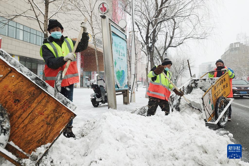 3月1日,在哈尔滨市香坊区一路段,环卫工人在清雪(无人机照片)。